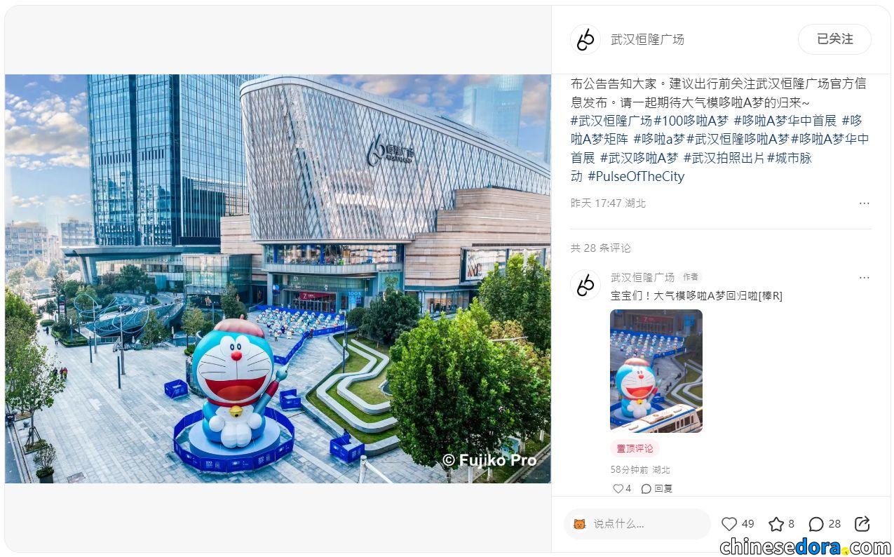 武漢站主辦場地武漢恒隆商場昨日(11.17)公佈,哆啦A夢氣模裝置因天氣條件暫時離開會場。而今日(11.18)早上展覽開放時間前,就已經有網民目擊充氣哆啦A夢恢復展出的情形,廣場方亦隨後在先前的公告下更新消息。