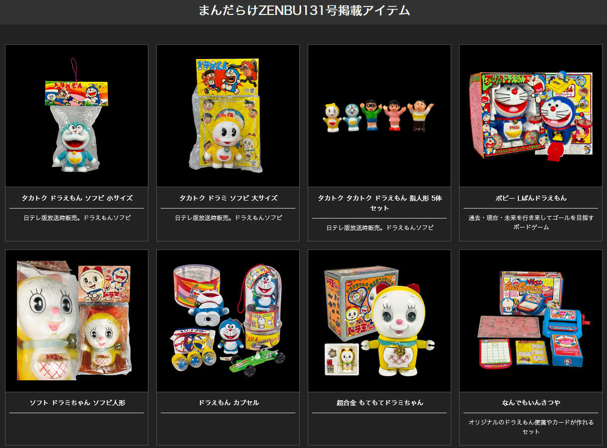 MANDARAKE 出版品網站中能看到本期專題收錄的各種歷史級珍品,包括作者藤子·F·不二雄、芝山努導演的親筆簽名色紙、初版瓢蟲漫畫《哆啦A夢》全45卷成套與月刊《快樂快樂》等早期刊物,動畫賽璐璐片以及玩具收藏,甚至連成人向與耽美類別的同人誌也一併收錄進去。