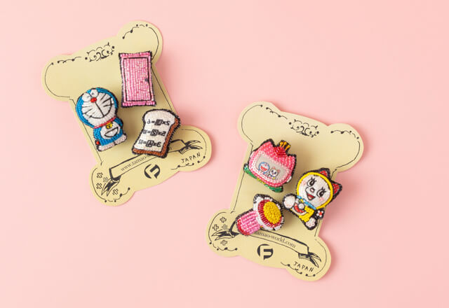 魅力刺繡胸針(左上:哆啦A夢/右下:哆啦美) 各 6,600 日圓(川崎市藤子・F・不二雄博物館)