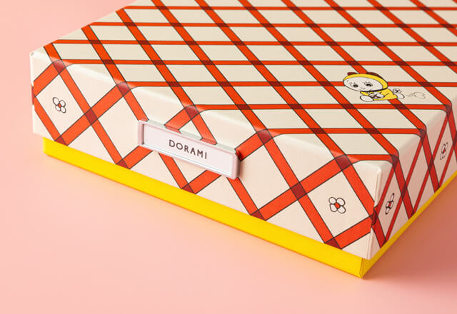 以哆啦美的四次元口袋花紋、及花朵元素設計的 A4 尺寸工具箱,尺寸約 33×24×7.5 公分。盒蓋內側附有哆啦美插畫,並具姓名牌可寫上個人名字。