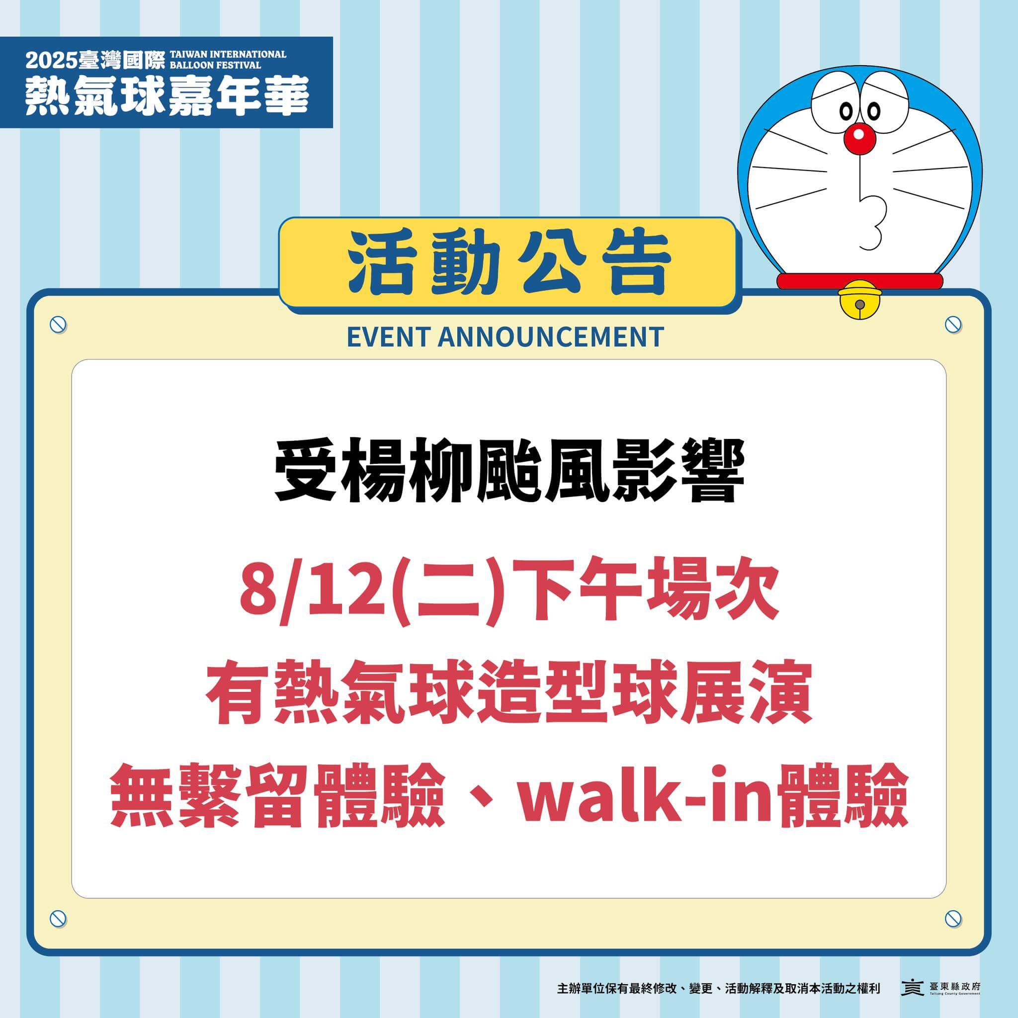 [台灣] 颱風楊柳襲台!2025台灣國際熱氣球嘉年華 8/12下午場局部開放、8/13~8/14取消、8/20復辦光雕音樂會