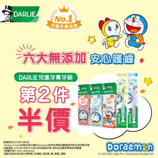 [香港] DARLIE 兒童牙膏牙刷限時買第2件半價 萬寧.百佳.屈臣氏.惠康.HKTVmall有售